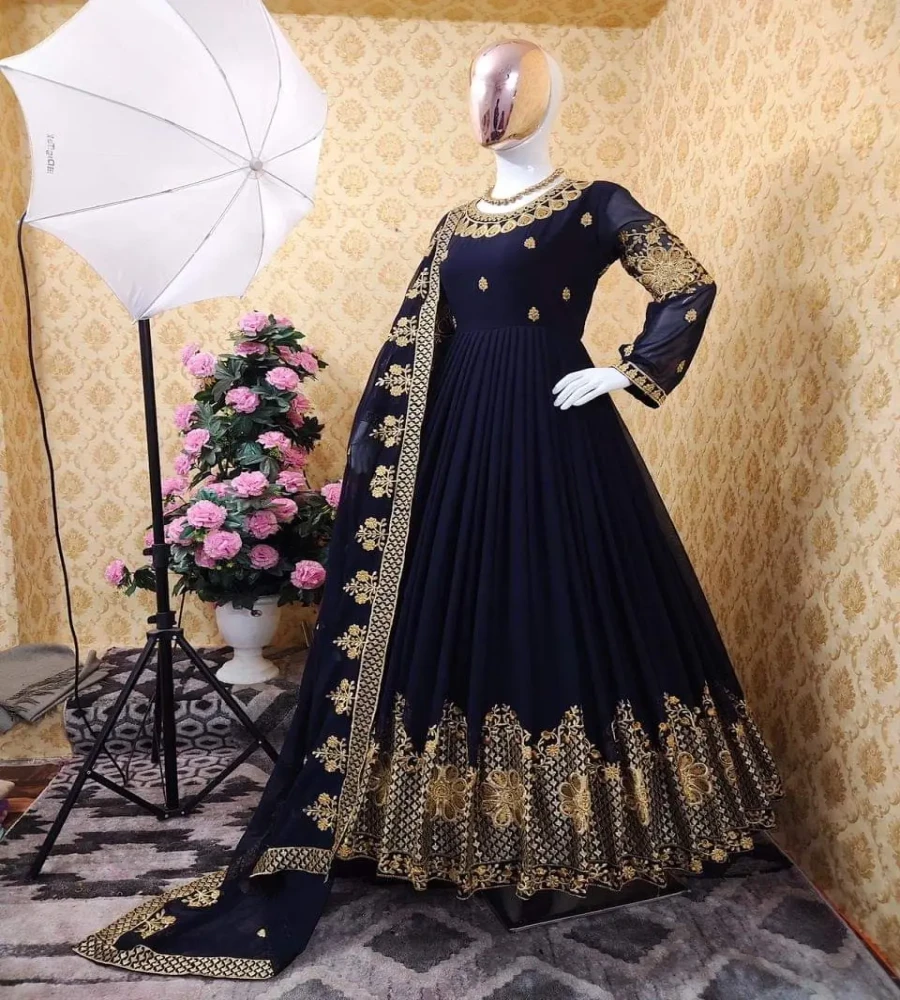সেমী স্টিচড জর্জেট এমব্রয়ডারি লং ফ্লোর টাচ আনারকলি পার্টি ড্রেস