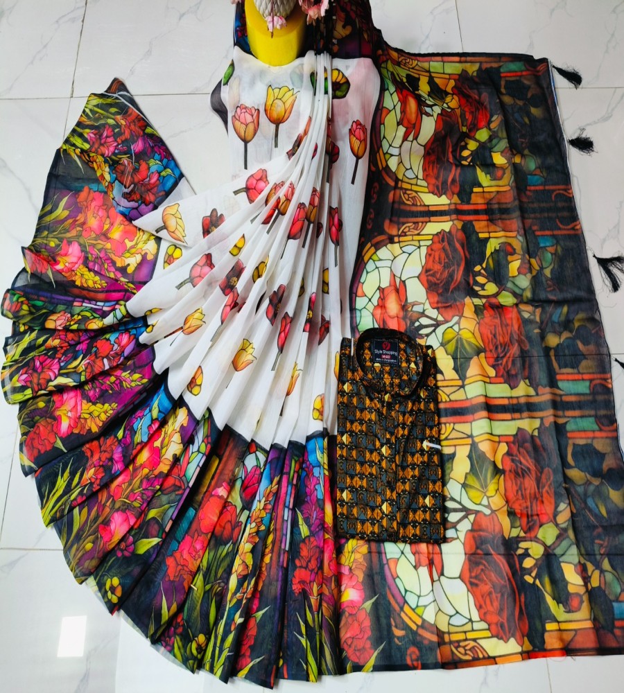 চান্দুরী ডিজিটাল প্রিন্টের শাড়ি এবং পাঞ্জাবি কাপল ড্রেস