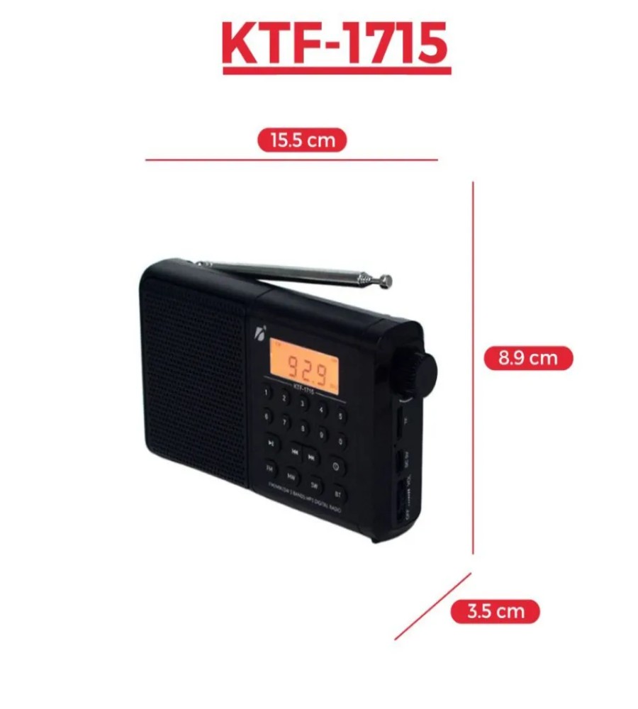 👉KTF-1715 একটি বহুমুখী ডিজিটাল ডিসপ্লে স্পিকার যা ব্লুটুথ, TF কার্ড এবং FM/MW/SW 3 ব্যান্ড রেডিও সমর্থন করে। এর ব্লুটুথ সংস্করণ 5.0, যা দ্রুত এবং স্থিতিশীল সংযোগ নিশ্চিত করে। আপনি USB চার্জিং ব্যবহার করে সহজেই এই স্পিকারটি চার্জ করতে পারবেন।