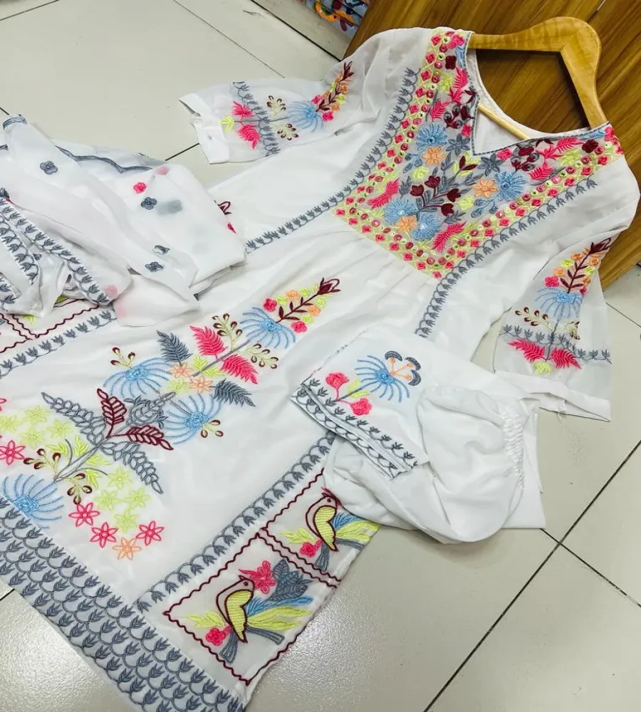 কামিজ:- ইন্ডিয়ান জর্জেট কাপড়ের উপর গর্জিয়াস কম্পিউটার এমব্রয়ডারি কাজ করা । বডি সাইজ:-ফ্রি সাইজ (৪৪)।লং :৪৭ ইঞ্চি